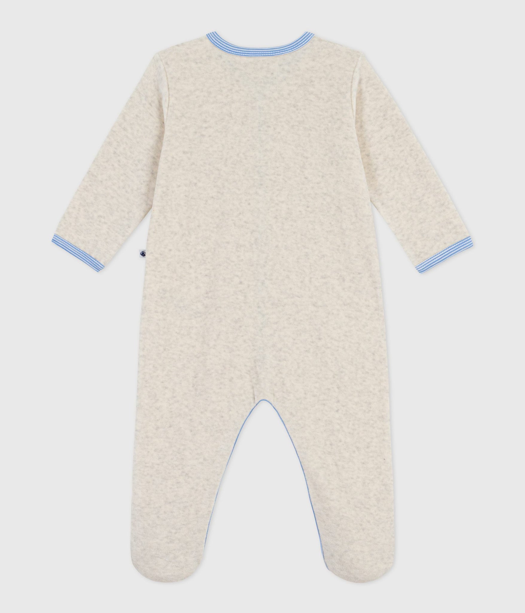 Baby boy velour front snap footie with blue trim