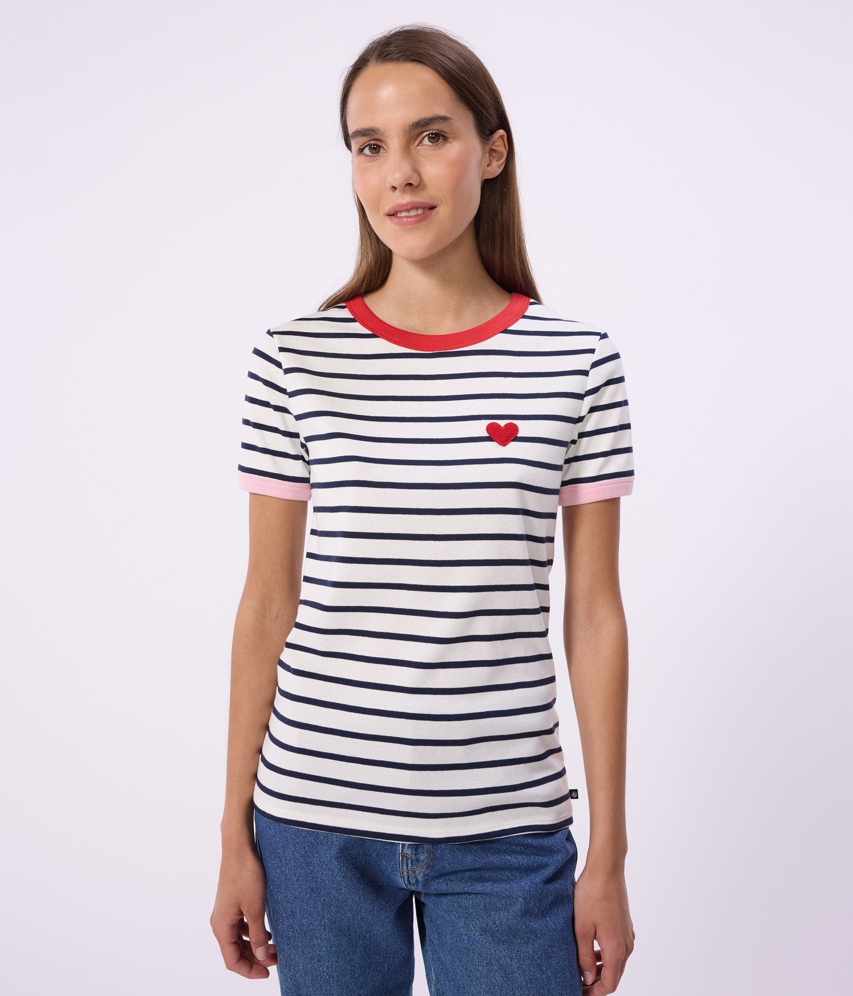 Women ss crew neck stripe tee with heart detail